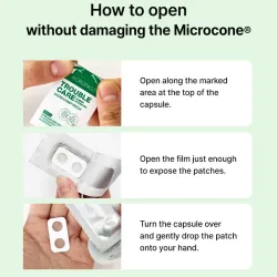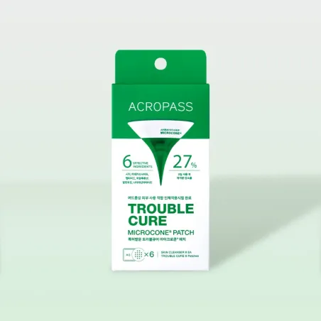 Acropass Trouble Cure est un traitement anti-imperfections en 2 étapes conçu pour les peaux à tendance acnéique. Sa technologie innovante de micro-aiguilles dissolvantes (¼ de l’épaisseur d’un cheveu) délivre en profondeur de la niacinamide, de l’acide hyaluronique et de l’arginine pour apaiser l’inflammation et éliminer les bactéries responsables des boutons. Le patch crée un environnement humide optimal favorisant une cicatrisation rapide sans marques ni taches. Facile à utiliser, il agit en quelques heures, sans douleur ni irritation.