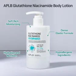 APLB Glutathione Niacinamide Body Lotion hydrate, apaise et illumine la peau grâce à un mélange de glutathione, niacinamide et trois extraits de centella asiatica. Sa texture lactée légère pénètre rapidement sans fini collant.
