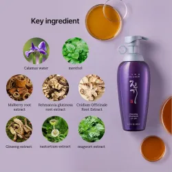 Eau, extrait de fleur/feuille/tige de chrysanthème boréal, laureth sulfate de sodium, lauryl sulfate de sodium, extrait de racine de rehmannia glutinosa, extrait de feuille de thuya orientalis, extrait d'artemisia vulgaris, cocamidopropyl bétaïne, diméthicone, extrait de fruit de Gleditsia Japonica, extrait d'écorce de morus alba, extrait d'eclipta prostrata, PEG-7 glycéryl cocoate, eau de rhizome d'acorus calamus, parfum, extrait de racine de cnidium officinale, cocamide MEA, décylène glycol, chlorure de sodium, carbomère, cocoyl alaninate de sodium, triéthanolamine, PEG-10, chlorure de guar hydroxypropyltrimonium, propylène glycol, menthol, hydroxyacétophénone, extrait d'épine de Lactobacillus/Centella Asiatica/Gleditsia Sinensis/Houttuynia Cordata/Phellodendron Amurense Extrait d'écorce/racine de Polygonum Cuspidatum/Prunella Vulgaris/Torilis Japonica, filtrat de fermentation, extrait de racine de Panax Ginseng, EDTA disodique, panthénol, butylène glycol, acide citrique, oxyde de lauramine, vinaigre de chêne, kératine hydrolysée, extrait de Portulaca Oleracea, 1,2-hexanediol, benzoate de sodium, phénoxyéthanol, linalol, alpha-isométhyl ionone, limonène, hexyl cinnamal, citronellol.