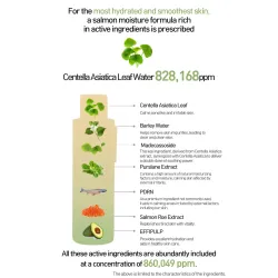 Eau de feuille de Centella Asiatica (828 168 ppm), eau, butylène glycol, eau de Houttuynia Cordata (30 380 ppm), propanediol, glycérine, 1,2-hexanediol, ADN de sodium, extrait d'œuf de saumon (1 500 ppm), madécassoside, extrait de Portulaca Oleracea, panthénol, extrait de fruit de Persea Gratissima (avocat), dextrine, extrait de Theobroma Cacao (cacao), allantoïne, maltodextrine, éthylhexylglycérine, hyaluronate de sodium, EDTA disodique