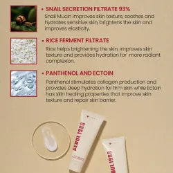 - Cette crème nourrissante est enrichie à 93 % de filtrat de bave d'escargot et de ferment de riz, offrant une hydratation intense tout en éclaircissant et apaisant la peau. Cette association renforce la barrière cutanée, laissant le teint revitalisé.