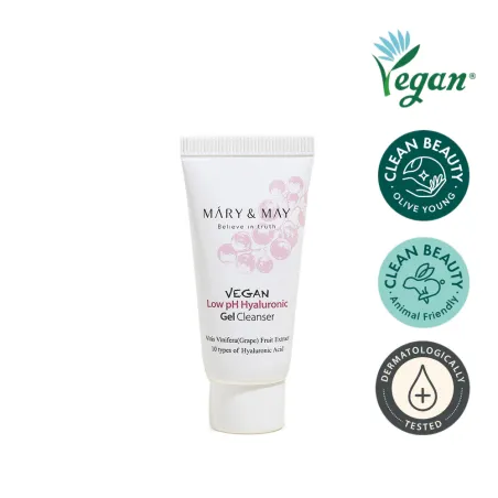- Mary&May Vegan pH Hyaluronic Gel to Foam Cleanser, nettoyant doux à faible pH jour et nuit, élimine les impuretés tout en renforçant la barrière cutanée.