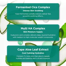Complexe de cica fermenté : Association de centella asiatica fermentée, acide hyaluronique et aloès du Cap pour hydrater, apaiser et renforcer la barrière cutanée.
