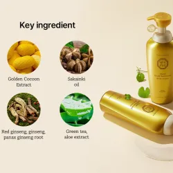 Eau, alcool cétéarylique, cyclopentasiloxane, extrait de chrysanthème sibiricum, stéaramidopropyl diméthylamine, diméthicone, extrait d'eclipta prostrata, acide glutamique, parfum, extrait de houttuynia cordata, phénoxyéthanol, huile de persea gratissima (avocat), bétaïne, ceteareth-20, extrait de fleur de lonicera japonica (chèvrefeuille), extrait de racine de rehmannia glutinosa, amodiméthicone, panthénol, huile de graines d'helianthus (tournesol), chlorure de cétrimonium, extrait de cocon de ver à soie, PEG-10, extrait de racine de zingiber officinale (gingembre), EDTA disodique, extrait de fleur, extrait de racine de carthamus tinnerax, butylène glycol, huile de graines de plukenetia volubilis, cyclotétrasiloxane, trideceth-12, extrait de crinum asiaticum, extrait de ginseng rouge, Extrait de feuille d'Aloe Barbadensis, glycérine, kératine, huile de graines de Bixa Orellana, kératine hydrolysée, kératine Alba, extrait d'écorce PVP, niacinamide, extrait de racine d'Angelica Gigas, lécithine hydrogénée, extrait de feuille de Camellia Sinensis, extrait de racine de Polygonum Multiflorum, acétate de tocophéryle, glycyrrhizate dipotassique, céramide NP.