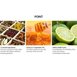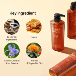 Eau, laureth sulfate de sodium, laurylsulfate d'ammonium, extrait de fleur/feuille/tige de chrysanthème boréal, cocamidopropyl bétaïne, extrait de feuille de thuya orientalis, extrait d'écorce de mûrier blanc, extrait de houttuynia cordata, extrait de racine de polygonum multiflorum, cocamide MEA, chlorure de sodium, glycérine, panthénol, diméthiconol, extrait de racine de rehmannia glutinosa, TEA-dodécylbenzènesulfonate, aminométhyl propanol, citrate de sodium, acide salicylique, chlorure de guar hydroxypropyltrimonium, menthol, EDTA disodique, extrait de racine de panax ginseng, extrait d'artemisia vulgaris, miel, extrait de feuille de camellia sinensis, butylène glycol, alcool, huile de graines de camellia japonica, huile de fleur de rosier canina, huile de graines de carthamus tinctorius (carthame), extrait de feuille d'aloe barbadensis, extrait de racine d'acorus calamus, Extrait de racine de Cynanchum Wilfordii, extrait de racine d'Ophiopogon Japonicus, extrait de racine d'Asparagus Lucidus, extrait de Poria Cocos, extrait de fruit de Foeniculum Vulgare (fenouil), 1,2-hexanediol, éthylhexylglycérine, sorbate de potassium, benzoate de sodium, phénoxyéthanol, parfum, limonène.