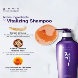 Ingrédients : eau, extrait de fleur/feuille/tige de chrysanthème boréal, laureth sulfate de sodium, lauryl sulfate de sodium, extrait de racine de rehmannia glutinosa, extrait de feuille de thuya orientalis, extrait d'artemisia vulgaris, cocamidopropyl bétaïne, diméthicone, extrait de fruit de Gleditsia Japonica, extrait d'écorce de morus alba, extrait d'eclipta prostrata, PEG-7 glycéryl cocoate, eau de rhizome d'acorus calamus, parfum, extrait de racine de cnidium officinale, cocamide MEA, décylène glycol, chlorure de sodium, carbomère, cocoyl alaninate de sodium, triéthanolamine, PEG-10, chlorure de guar hydroxypropyltrimonium, propylène glycol, menthol, hydroxyacétophénone, extrait d'épine de Lactobacillus/Centella Asiatica/Gleditsia Sinensis/Houttuynia Cordata/Phellodendron Amurense Extrait d'écorce/racine de Polygonum Cuspidatum/Prunella Vulgaris/Torilis Japonica, filtrat de fermentation, extrait de racine de Panax Ginseng, EDTA disodique, panthénol, butylène glycol, acide citrique, oxyde de lauramine, vinaigre de chêne, kératine hydrolysée, extrait de Portulaca Oleracea, 1,2-hexanediol, benzoate de sodium, phénoxyéthanol, linalol, alpha-isométhyl ionone, limonène, hexyl cinnamal, citronellol.