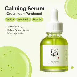 Le Sérum Apaisant The Beauty of Joseon : Thé Vert + Panthénol est un sérum apaisant enrichi en ingrédients naturels issus de la médecine traditionnelle coréenne (hanbang) pour calmer et hydrater la peau. Ce sérum est enrichi en ingrédients certifiés EWG Green Grade, dont 50 % d'eau de feuilles de thé vert, 30 % d'extrait d'armoise et 5 % de panthénol, pour apaiser les peaux abîmées et sensibles. Il offre également des propriétés hydratantes, anti-âge et éclaircissantes pour un teint clair, sain et éclatant de jeunesse. Convient à tous les types de peau, notamment aux peaux irritées ou sensibles.