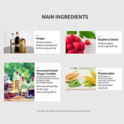 Eau, vinaigre, extrait de fruit de Rubus Idaeus (framboise), huile de pépins de framboise/esters d'aminopropanediol de succinate de tocophéryle, protéines de maïs hydrolysées, protéines de soja hydrolysées, protéines de blé hydrolysées, extrait de Lavandula Angustifolia (lavande), extrait de feuille de Melaleuca Alternifolia (arbre à thé), extrait de feuille de Rosmarinus Officinalis (romarin), filtrat de fermentation de Saccharomyces, glycérine, octyldodéceth-16, huile de ricin hydrogénée PEG-60, butylène glycol, chlorure de cétrimonium, caprylyl glycol, polyquaternium-7, 1,2-hexanediol, citrate de sodium, pentylène glycol, éthylhexylglycérine, octanediol, éthanol, EDTA disodique, benzoate de sodium, phénoxyéthanol, parfum, limonène, Linalol, hexyl cinnamal, salicylate de benzyle